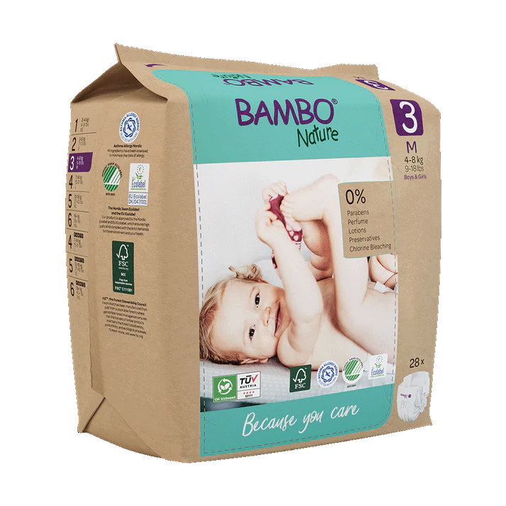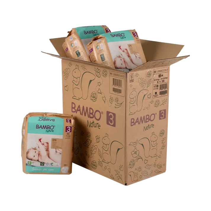 Bambo Nature 3 M luiers vriendelijk voor babyhuid en milieu.